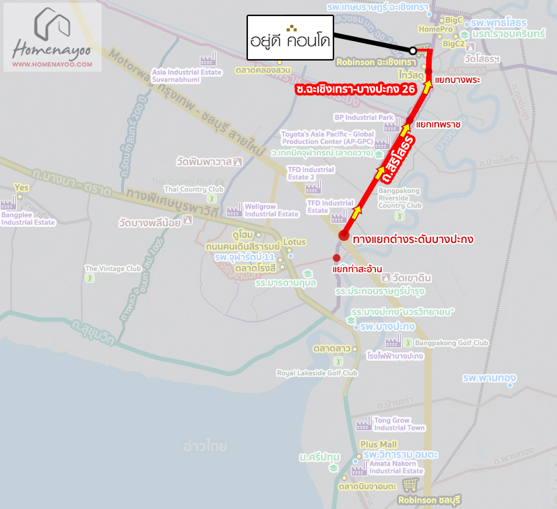การเดินทางเริ่มจาก ถ.สิริโสธร (ถ.บางปะกง-ฉะเชิงเทรา) ⇒ แยก BP Industrial ⇒ แยกบางพระ (บายพาสฉะเชิงเทรา) ⇒ Robinson ฉะเชิงเทรา เลี้ยวเข้า ซ.ฉะเชิงเทรา-บางปะกง 26 ขับตรงไปประมาณ 500 ม. ถึงโครงการ อยู่ดี คอนโด *หลัง Robinson ฉะเชิงเทรา