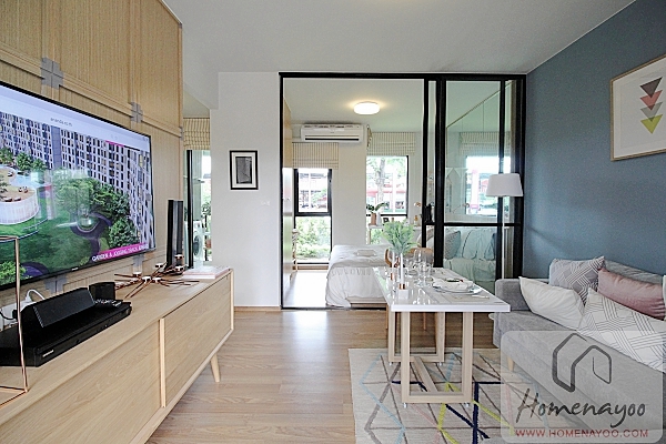 เดินเข้าห้องมาจะเจอส่วนของห้องนั่งเล่นก่อน ฝั่งขวามือของห้องนั่งเล่นเป็นส่วนครัวและห้องนำ้ มองตรงไปเป็นส่วนห้องนอนมีฉากกั้นระหว่างห้องนอนกับห้องนั่งเล่นมาให้ดูเป็นไอเดีย พื้นห้องจะเป็นไม้ลามิเนตสีอ่อนหนา 8 mm. ไฟติดเพดานเป็นโคมซาลาเปา ของจริงได้ตามนี้ค่ะ