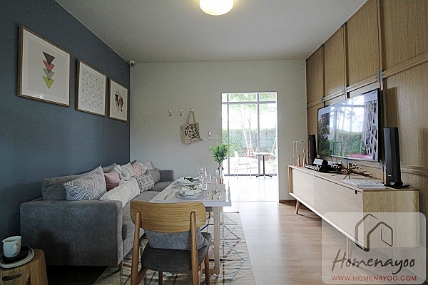 มองกลับไปที่ประตูทางเข้าห้องค่ะ จากในภาพจะเห็นระยะดูทีวีจากโซฟาประมาณ 2.5 m. พอวางโต๊ะกาแฟได้ ผนังของจริงที่ได้จะเป็นผนังฉาบเรียบทาสีทั้งหมดนะคะ ห้องตัวอย่างกรุผนังตกแต่งมาให้ดูเป็นไอเดีย