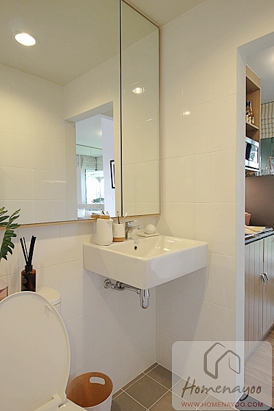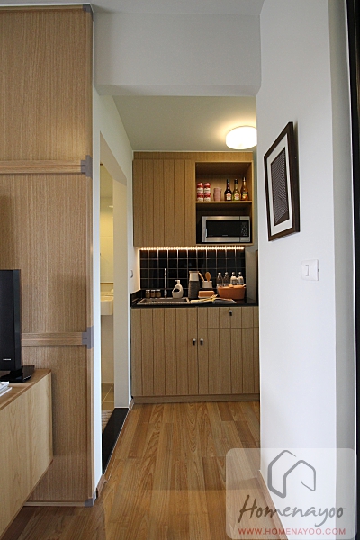 ออกจากห้องน้ำมาดูส่วนครัวกันต่อค่ะ ชุดครัวด้านบนมีชั้นลอยพร้อมหน้าบานมาให้ ของจริงได้ตามที่เห็นนะคะ หน้าบานเป็นลายไม้เซาะร่องดูดีทีเดียว เปิดให้ดูช่องเก็บของด้านในก็มีที่เก็บของมาให้พอสมควร เหมาะสำหรับใช้อุ่นอาหาร ล้างจาน หรืออาหารที่ประกอบง่ายๆไม่ซับซ้อนนะคะ