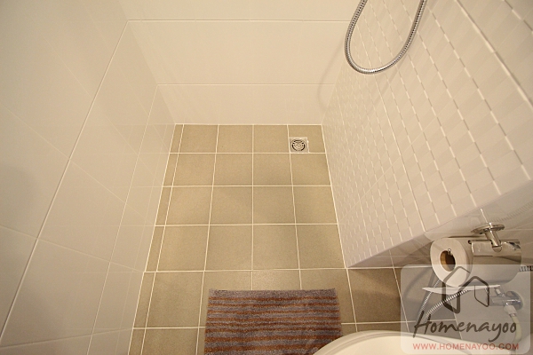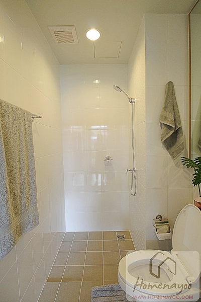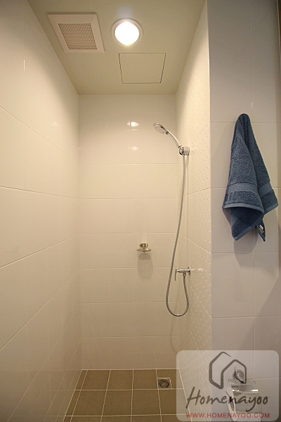 ส่วนเปียกหรือส่วนอาบน้ำผนังจะยุบเข้าไปแบบนี้ เพดานส่วนมุมอาบน้ำจะเป็นพัดลมดูดอากาศและไฟดาวน์ไลท์ สามารถกั้นฉากกั้นอาบน้ำกระจกเทมเปอร์เพิ่มได้
