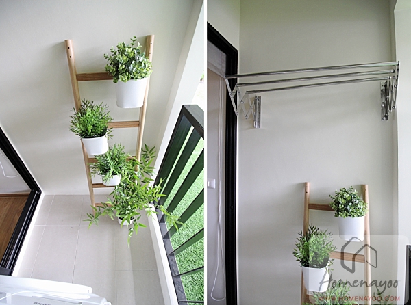 ส่วนระเบียงด้านบนติดราวสแตนเลสสำหรับตากผ้ามาให้ดูเป็นไอเดีย และที่ระเบียงอีกฝั่งจะแขวนแอร์คอมเพรสเซอร์มาให้ด้านบน ทำให้ใช้งานพื้นใต้แอร์คอมเพรสเซอร์วางเครื่องซักผ้า มีเต้าเสียบปลั๊กไฟฟ้าพร้อมฝาครอบกันน้ำติดผนังมาให้ ข้างเครื่องซักผ้าวางกระถางต้นไม้บนขั้นบันไดมาให้ดูระยะใช้งาน