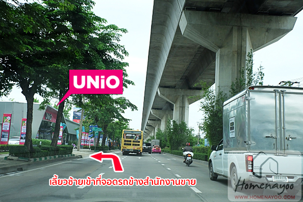 ข้างสำนักงานขายโครงการ Unio สุขุมวิท 72 จะมีที่จอดรถอยู่นะคะ เราเลี้ยวซ้ายเข้าที่จอดรถได้เลย