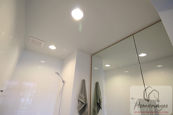 ผนังห้องน้ำปูกระเบื้องมาให้จนจรดเพดาน ที่เพดานติดไฟดาวน์ไลท์มาให้ พร้อมพัดลมดูดอากาศ
