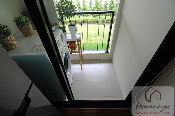 ที่ระเบียงอีกฝั่งจะแขวนแอร์คอมเพรสเซอร์มาให้ด้านบน ทำให้ใช้งานพื้นใต้แอร์คอมเพรสเซอร์ได้ ห้องตัวอย่างวางเครื่องซักผ้ามาให้ดูระยะใช้งาน มีเต้าเสียบปลั๊กไฟฟ้าพร้อมฝาครอบกันน้ำติดผนังมาให้ และที่พื้นระเบียงเดินท่อระบายนำ้มาให้เรียบร้อย