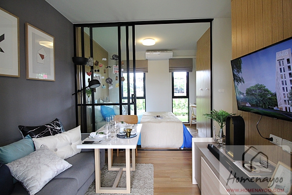 โครงการ Unio สุขุมวิท 72 มีแบบห้องให้เลือกเริ่มต้นตั้งแต่ Studio ขนาด 22.44-27.30 ตร.ม. โดยห้องแบบ Studio จะมีจำนวนถึง 80% ของยูนิตในโครงการทั้งหมดนะคะ ห้องตัวอย่างของโครงการจึงเป็นห้องแบบ Studio ทั้งหมดนั่นเอง