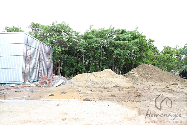 เข้าไปด้านในที่ดินโครงการมองไปทางทิศตะวันตก มองไปมีกลุ่มบ้านสูง 2 ชั้นอยู่ ฝั่งนี้แทบทั้งด้านจะเป็นพื้นที่โครงการในอนาคตที่ตอนนี้ก็กำลังเคลียร์ที่ดินอยู่เช่นกัน