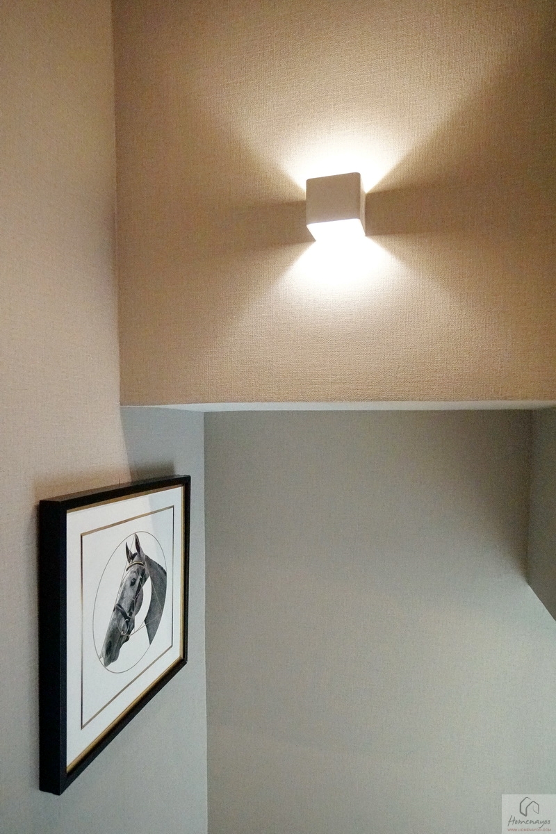 ตรงข้ามกับโซฟาสามารถ Built-in ชั้นวางของที่ข้างโถงบันได และวางชั้นวางทีวีตัวยาวประมาณ 2 ม. ได้เลยค่ะ ในส่วนของบ้านจริงจะเป็นผนังเปล่าฉาบเรียบทาสีพื้น ที่มีการเดินงานระบบไฟฟ้า เต้าเสียบปลั๊กไฟและช่องเสียบสาย Cable TV มาให้พร้อมต่อใช้งาน