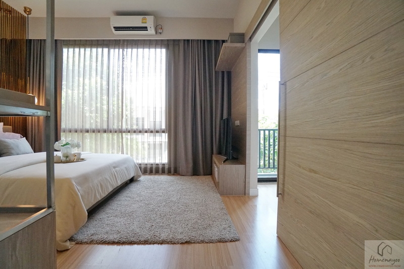 เข้ามาด้านในทางโครงการจะ Built-in ตู้เสื้อผ้าพอดีผนังห้องมาให้ดูเป็นไอเดียแบบนี้ ด้านหน้าตู้จะมีพื้นที่เหลือให้ยืนแต่งตัว เลือกหยิบเสื้อผ้า รวมถึงเดินเข้า-ออกห้องน้ำ และระเบียงได้สบาย ๆ