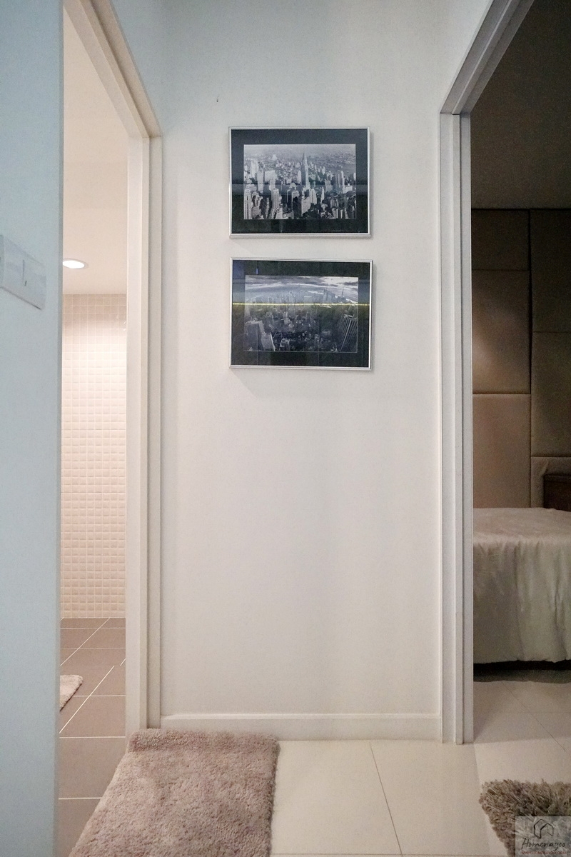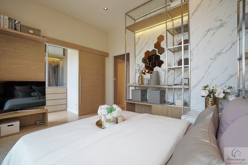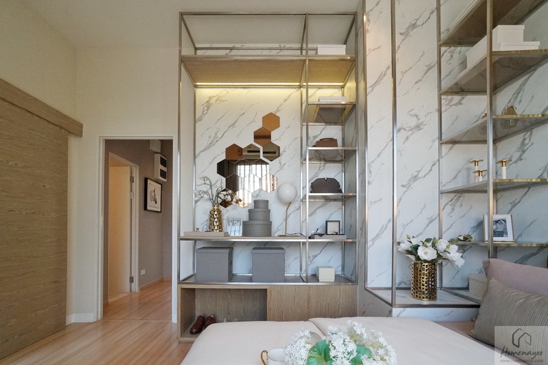 มองไปทางปลายเตียง จะเป็นส่วนของ Walk-in Closet, ห้องน้ำ และระเบียงส่วนตัวทางฝั่งหน้าบ้าน โดยบ้านตัวอย่างจะกั้นผนังแยกส่วน พร้อมวางชั้นวางทีวีปลายเตียงให้ดูเป็นแนวทาง
