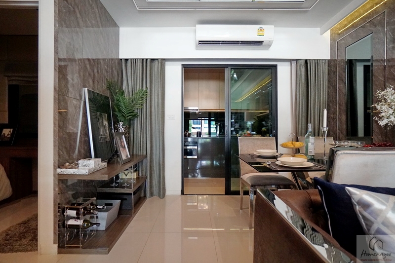 ตรงข้ามโต๊ะทานอาหาร จะมีพื้นที่เหลือแนวยาว ให้เราวางชั้นวางของ, ตู้เก็บของ หรือจะใช้พื้นที่ตรงนี้ทำเป็นมุม Pantry หรือ Coffee Station ก็ได้ค่ะ