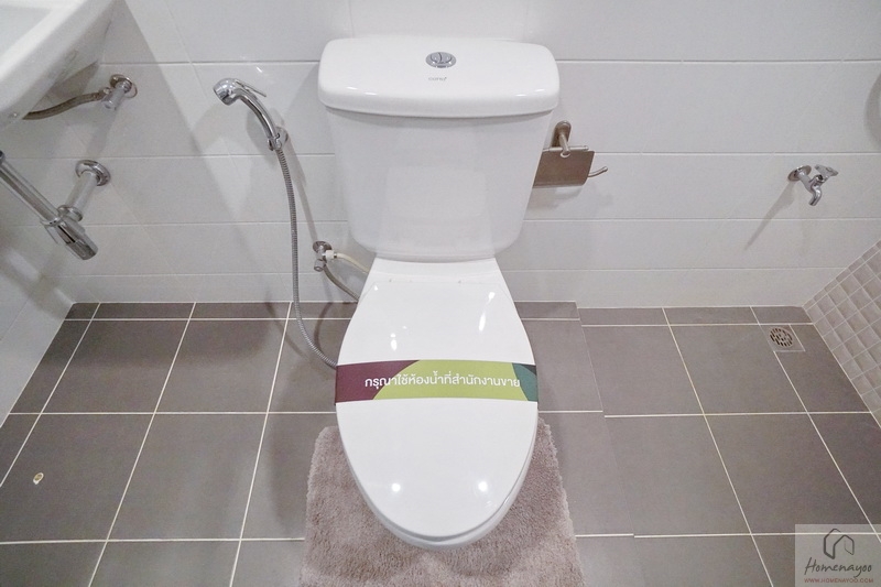 ด้านในติดตั้งฝักบัว Hand Shower ก๊อกน้ำโครเมียมก้านโยก พร้อมก๊อกสนามด้านล่าง ผนังมีที่วางสบู่ให้ 1 ชิ้น พร้อมเดินงานระบบไฟฟ้า รองรับการติดเครื่องทำน้ำอุ่นมาให้เรียบร้อย