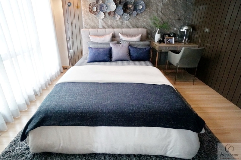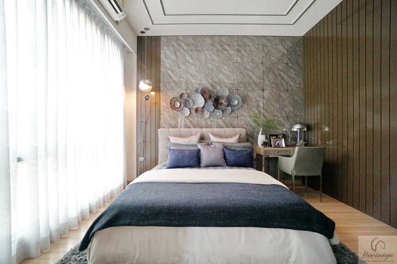 ในบ้านตัวอย่างจะวางเตียง 5 ฟุต มาให้ดูระยะใช้งาน ซึ่งห้องจริงจะลดเป็น 3.5 ฟุต หรือเพิ่มเป็น 6 ฟุต ก็ได้ รอบ ๆ เตียงมีพื้นที่เหลือให้ใช้งานได้สบาย ๆ
