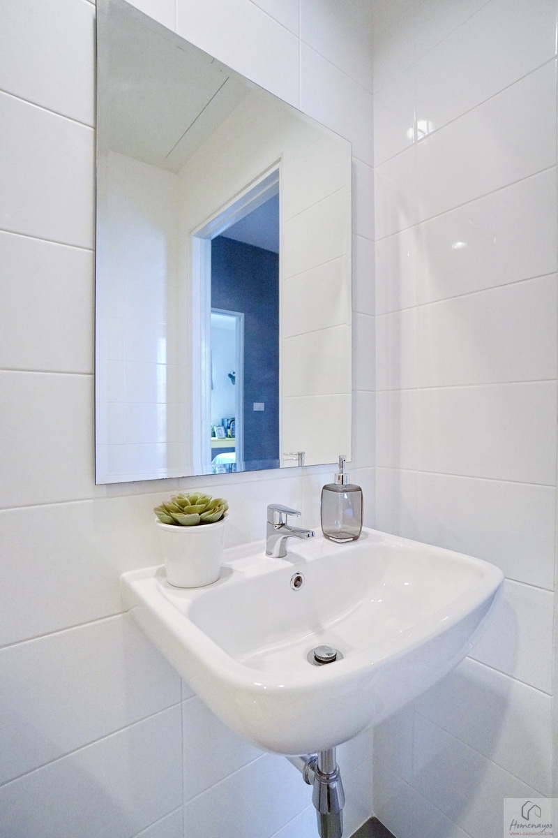 อ่างล้างหน้าแบบแขวนผนัง ด้านหลังติดกระจกเงาสี่เหลี่ยมให้ 1 บาน และมี Door Stopper ที่ใช้เป็นที่แขวนผ้าเช็ดตัวได้