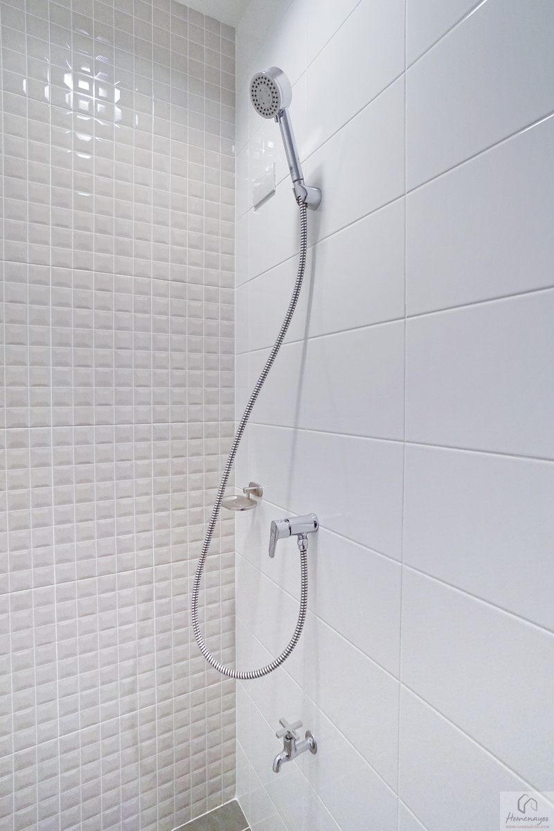 ส่วนอาบน้ำเข้ามุมห้อง ใช้ฝักบัว Hand Shower ก๊อกน้ำโครเมียมก้านโยก มีที่วางสบู่ฝังกำแพง และก๊อกน้ำด้านล่าง 1 ชิ้น ผนังเดินงานระบบรองรับการติดตั้งเครื่องทำน้ำอุ่นให้พร้อมใช้งาน