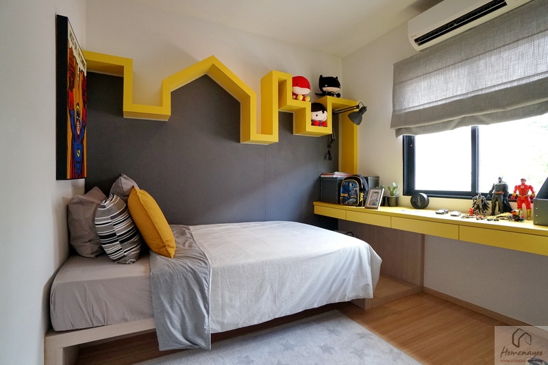 บ้านตัวอย่างตกแต่งเป็นห้องนอนเด็ก เลยจัดวางเตียงเดี่ยว 3.5 ฟุต ชิดผนังห้องด้านในมาให้ดูระยะใช้งาน