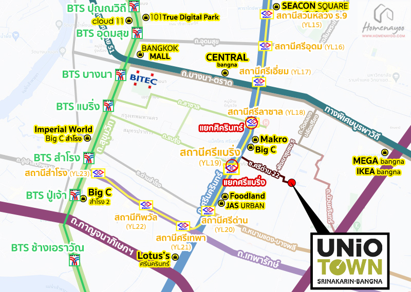 Unio Town ศรีนครินทร์-บางนา ทาวน์โฮมหน้ากว้าง บรรยากาศบ้านเดี่ยว ตั้งอยู่บนทำเลศักยภาพย่าน ‘ศรีนครินทร์-บางนา’ ใกล้แนวรถไฟฟ้า 2 สาย ทั้งรถไฟฟ้าสายสีเหลือง สถานีศรีแบริ่ง ที่จะเปิดใช้งานครบแล้วทั้ง 23 สถานี และอีกสายจะเป็นรถไฟฟ้าสายสีเขียว สถานีแบริ่ง