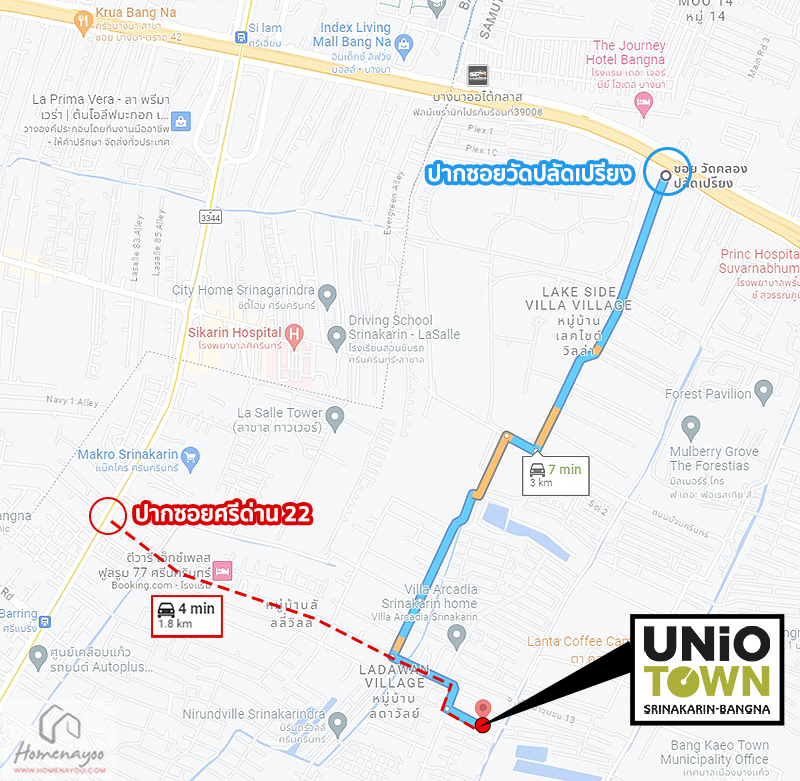 การเดินทางเริ่มจากแยกศรีเทพา ⇒ ถนนศรีนครินทร์ ⇒ กลับรถ ⇒ ซอยศรีด่าน 22 ⇒ ซอยพัฒนาชุมชน 17 ⇒ Unio Town ศรีนครินทร์-บางนา ห่างจากสถานีศรีแบริ่ง (YL19) ประมาณ 2.4 กม.*