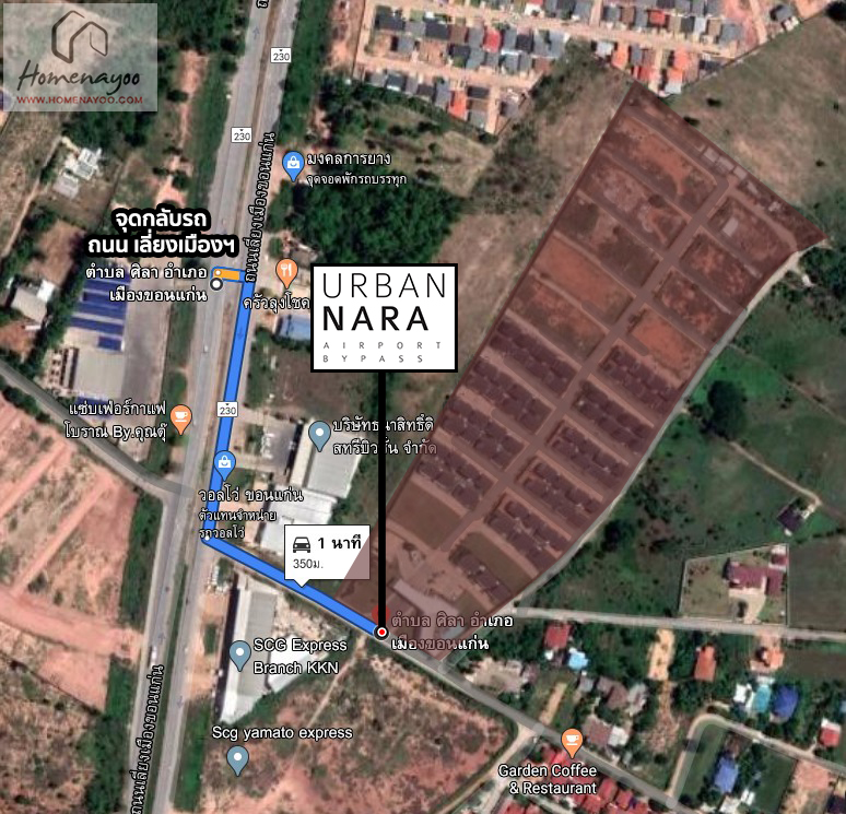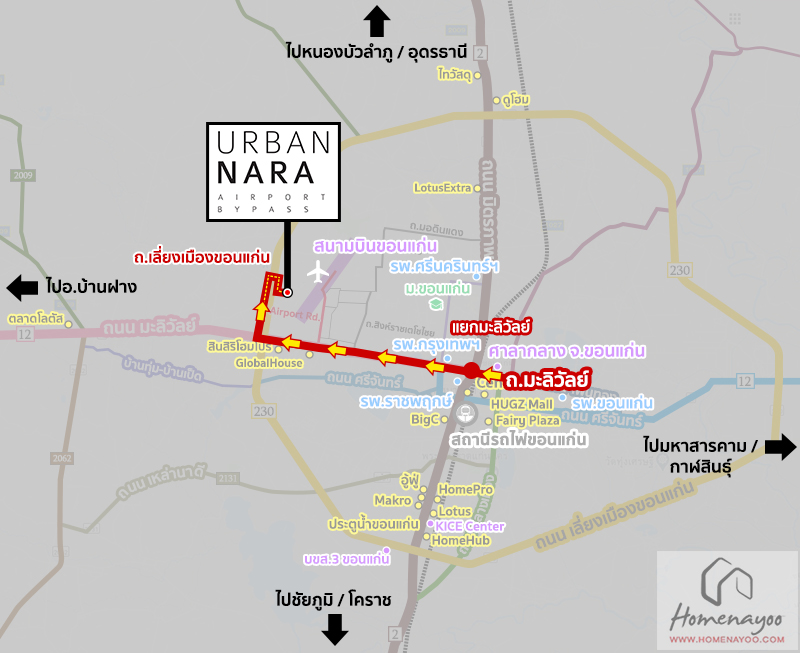 การเดินทางเริ่มจาก แยกมะลิวัลย์ ⇒ ถ.มะลิวัลย์ ⇒ แยกบายพาสวงแหวนมะลิวัลย์ ⇒ ถ.เลี่ยงเมืองขอนแก่น ขับตรงไปประมาณ 1.5 กม. กลับรถ ถึงทางเข้าโครงการ เออเบิน นารา แอร์พอร์ต-บายพาส *ใกล้สนามบินขอนแก่น