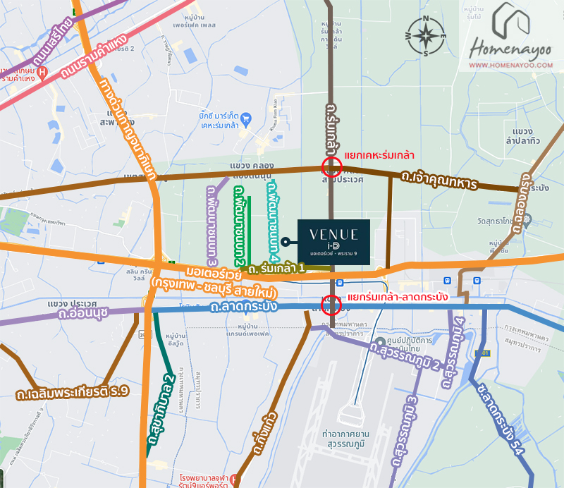 โครงการ VENUE ID มอเตอร์เวย์-พระราม 9 ตั้งอยู่ภายในถนนพัฒนาชนบท 4 ซึ่งตัวซอยจะเข้า-ออก ได้จากถนนร่มเกล้า 1 เป็นเส้นทางหลักค่ะ บรรยากาศภายในซอยจะมีคนอยู่อาศัยค่อนข้างคึกคัก มีโครงการบ้านจัดสรรหลายโครงการ รวมถึงที่อยู่อาศัยดั้งเดิมที่เปิดเป็นกิจการต่าง ๆ ค่ะ
