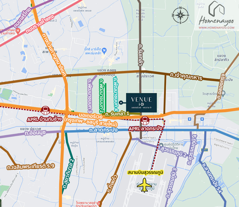 ทำเลที่ตั้งโครงการ : โครงการ VENUE ID มอเตอร์เวย์-พระราม 9 ที่ตั้งโครงการเหมาะกับคนที่มองหาบ้านเดี่ยวหลังใหญ่ใกล้เมืองค่ะ ตัวโครงการตั้งอยู่บนถนนพัฒนาชนบท 4 ใกล้ทางคู่ขนานมอเตอร์เวย์ ระยะทางประมาณ 1.5 กม.* ข้อดี คือสามารถวิ่งเข้า-ออกเมืองได้ง่าย ไม่ว่าจะเป็นโซน พระราม 9, รัชดา, อโศก, อ่อนนุช และในโซนรอบนอกตัวเมืองอย่าง ลาดกระบัง, ร่มเกล้า รวมสนามบินสุวรรณภูมิ และสามารถเลือกใช้รถไฟฟ้าที่ใกล้โครงการคือ APRL ลาดกระบัง ประมาณ 2.6 กม.*