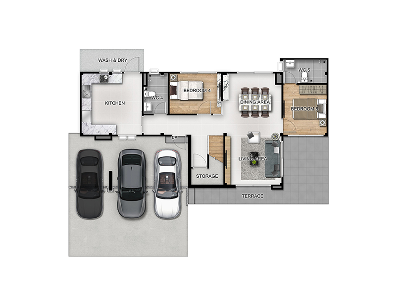 แปลนบ้านชั้น 1 พื้นที่หน้าบ้านเป็นที่จอดรถ 2 จอด ส่วนภายในตัวบ้านจะเน้นพื้นที่ Common Area โดยจะแบ่งเป็นห้องนั่งเล่น 2 ส่วน คือ Living Area และ Double Living อีกส่วนจะแบ่งเป็นมุมห้องทานอาหาร ซึ่งพื้นที่ในส่วน Common Area นี้ เราสามารถที่จะปรับกั้นห้องเป็นห้องนอนชั้นล่างเพิ่มได้ค่ะ