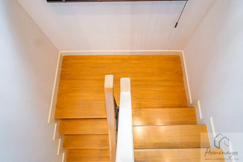 มาที่บริเวณโถงบันไดจะมีห้องเก็บของ ใช้พื้นที่ใต้บันได มีประตูปิดมาให้เรียบร้อยเป็นสัดส่วน พร้อมติดตั้งไฟฟลูออเรสเซ้นต์มาให้ 1 ดวง เพื่อความสะดวกในการหยิบหาของ