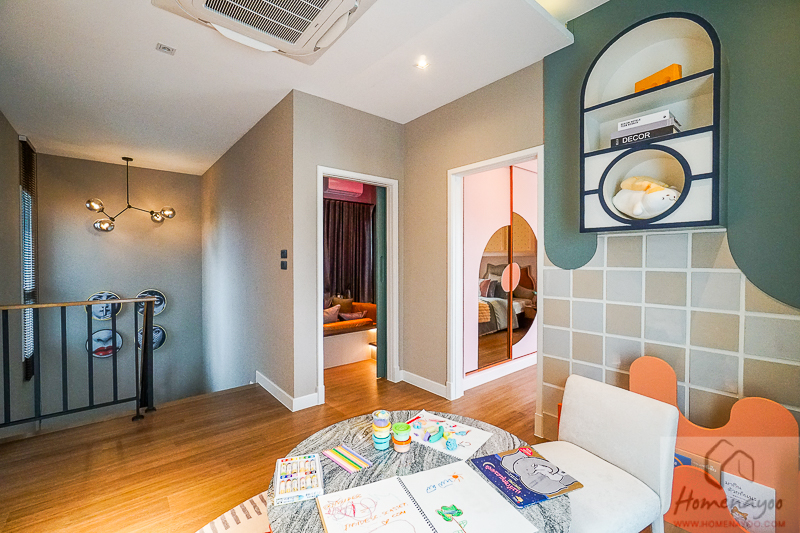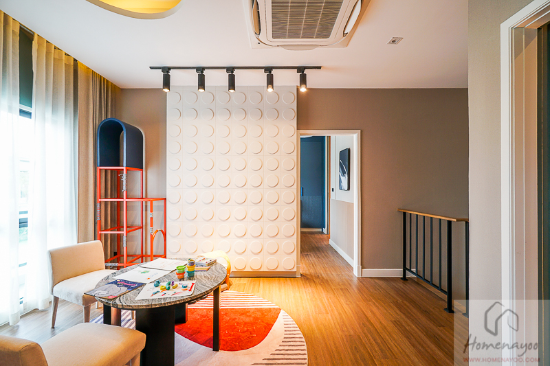 ขึ้นมาที่ชั้น 2 พื้นปู SPC ลายไม้ทั้งชั้น ส่วนแรกที่เราเจอจะเป็นฟังก์ชันของ Family Area ที่เราสามารถจัดการใช้งานได้หลากหลาย ไม่ว่าจะเป็นพื้นที่พักผ่อน หรือห้องทำงาน