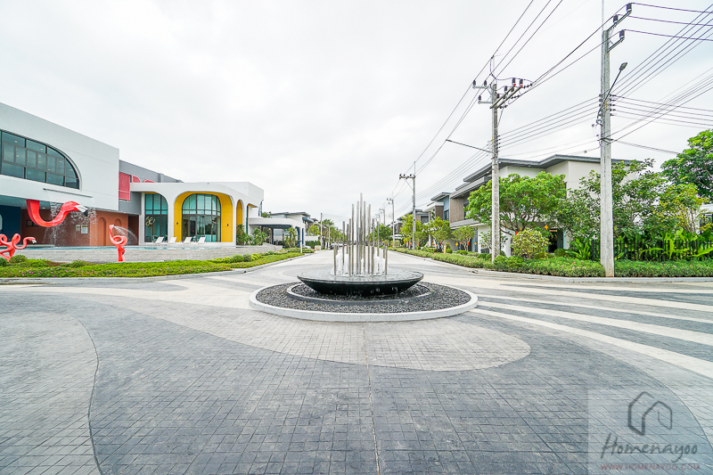 โซนหน้าโครงการจะจัดเป็นพื้นที่ส่วนกลางหลัก เปิดด้วยวงเวียนน้ำพุด้านหน้า วางไว้เป็น Center ของถนนหลัก