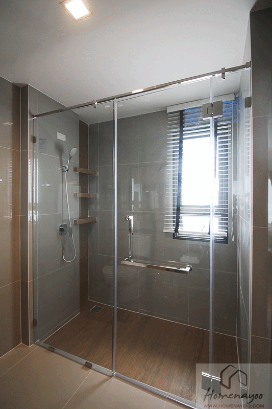 เฉพาะห้องน้ำในตัวห้องนอนใหญ่ จะติดฉากกั้นอาบน้ำมาให้เรียบร้อยเลยค่ะ เป็นกระจกนิรภัย ขนาดของโซนอาบน้ำกว้างขวางมาก จริงๆแล้วจะวางอ่างอาบน้ำแทนก็ยังได้