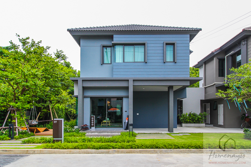 แบบบ้าน – ที่นี่มีให้เลือกแบบเดียว โดยมีส่วนที่เชื่อมกับบ้านอีกหลังคือส่วนครัวไทยที่ใช้ผนังร่วมกัน บ้านรูปทรงสไตล์ Modern ใช้โทนสีดูเข้มขรึมทันสมัยขึ้น มีให้เลือก 2 สี คือน้ำเงินเข้ม และน้ำตาล ตัดด้วยเทาเข้ม ภายในบ้านออกแบบมาได้น่าอยู่ครับ เน้นช่องแสงภายในบ้าน ได้กระจกบานใหญ่ ทุกส่วนในบ้านจะมีแสงธรรมชาติเข้าถึงช่วยให้ประหยัดไฟได้ แต่ละส่วนของบ้านแบ่งพื้นที่มาให้ไม่อึดอัด ดูโปร่งโล่ง ฝ้าสูง 2.6 ม. พื้นที่ในบ้านสามารถปรับเปลี่ยนได้ตามความต้องการ ห้อง Master Bedroom มีส่วนที่สามารถทำ Walk in closetได้ ห้องนอนเล็กมีพื้นที่มาให้พอประมาณ สามารถวางโต๊ะ ตู้ เตียงได้