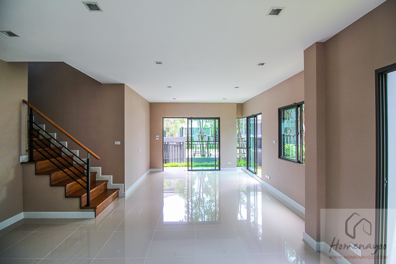 วัสดุในบ้าน – ได้ของมีคุณภาพ เริ่มตั้งแต่ประตูหน้าบ้าน และหน้าต่างทุกบานได้กระจกใสเขียวตัดแสงบานเลื่อนกรอบประตูเป็นอลูมิเนียม พื้นชั้นล่างเป็นกระเบื้องแกรนิตโต้ 60 x 60 ซม. พื้นชั้น 2 เป็นไม้ลามิเนตหนา 8 มม. ผนังจะได้เป็นวอลเปเปอร์ทั้งหลัง ไฟได้ดาวน์ไลท์ทุกส่วน ห้องครัวได้แบบโล่งๆให้ต่อเติมตามความชอบ และมีพื้นที่ส่วนครัวไทยทำพื้นและผนังมาให้แล้ว ต่อเติมชุดเคาน์เตอร์ครัวเพิ่มอย่างเดียว เดินระบบน้ำไว้ให้เรียบร้อย สุขภัณฑ์ในห้องน้ำเป็นของ American Standard บ้านทุกหลังติดตั้งสัณญาณกันขโมยแบบ Shock Sensor & Magnetic
