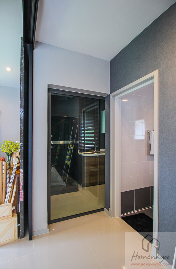 กลับมาที่บ้านตัวอย่าง ถัดจากห้องนั่งเล่น จะเป็นห้องน้ำ และห้องครัว
