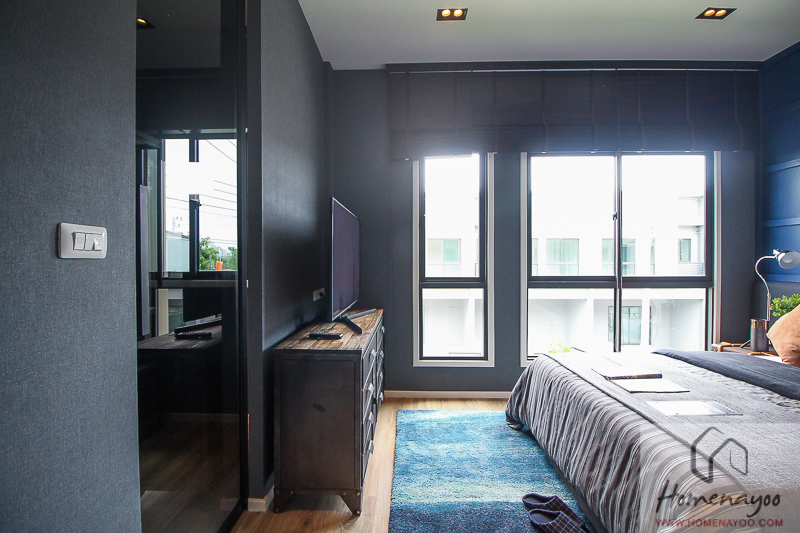 พื้นที่ฝั่งปลายเตียงสามารถกั้นห้องเพื่อใช้เป็น Walk – in Closet ได้ อย่างในบ้านตัวอย่างก็จะกั้นมาให้แล้วยังเหลือพื้นที่ปลายเตียงให้วางชั้นวางทีวี และมีระยะที่เดินผ่านได้สะดวกอยู่ค่ะ