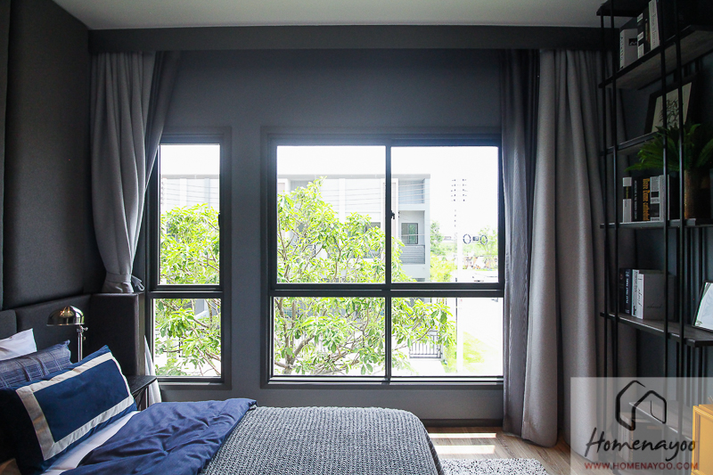 อย่างในบ้านตัวอย่างจัดมาเป็นเตียงควีนไซส์ จะมีพื้นที่เหลือข้างเตียงพอให้วางโต๊ะหัวเตียงได้ค่ะ