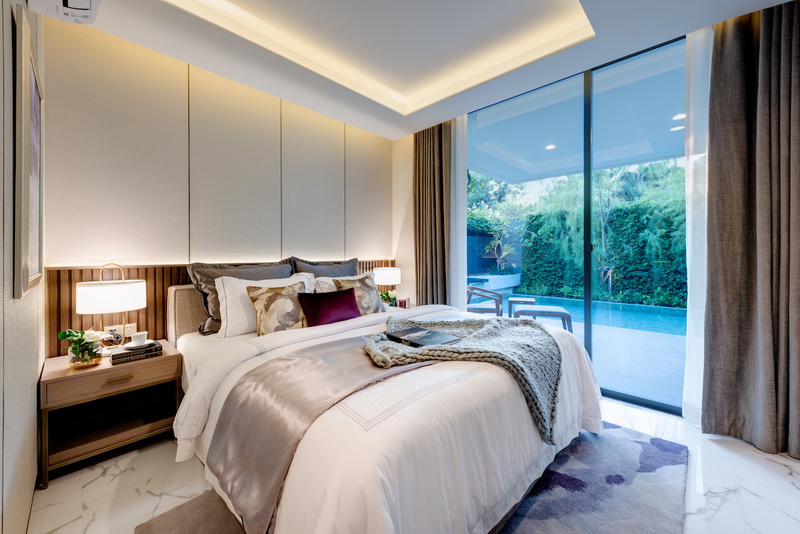 Master Bedroom ออกแบบลักษณะ Cubic Shape ให้ยื่นลอยอยู่กลางสระว่ายน้ำพร้อมกระจกสูง ทุกมุมมองคุณจึงสัมผัสกับธรรมชาติที่โอบล้อมในทุกๆเช้า พร้อมฟังก์ชั่นพิเศษที่จัดสรรอย่าง ลงตัวให้มีห้องน้ำ และ Walk-in Closet เพิ่มความสะดวกสบายให้ผู้อยู่อาศัยมากยิ่งขึ้น