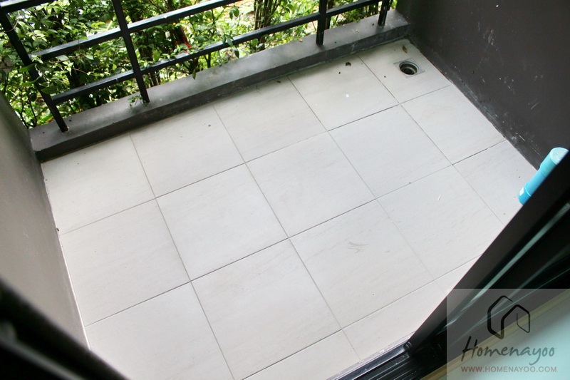 เปิดประตูออกมา…จะเจอกับระเบียงแบบหน้ากว้าง ปูพื้นกระเบื้องเซรามิกลายหินกันลื่น 30 x 30 ซม. พื้นที่ใช้งาน ขนาด 2.8 x 1.0 เมตร สามารถวางราวตากผ้าขนาดกลางได้สบาย ๆ หรือจะใช้พื้นที่บริเวณนี้ตกแต่งสวนหย่อมเพิ่มพื้นที่สีเขียวให้แก่ห้องพักก็ทำได้สบาย ๆ