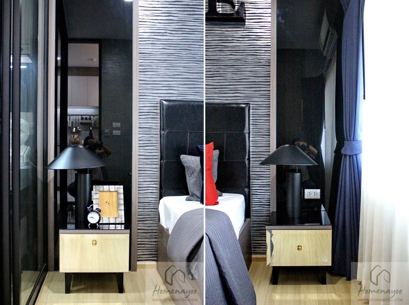 ข้างเตียงนอนได้โต๊ะหัวเตียง พร้อมลิ้นชักเก็บของ 1 ตัว ผนังติดตั้งเต้าเสียบปลั๊กไฟให้ 1 จุด