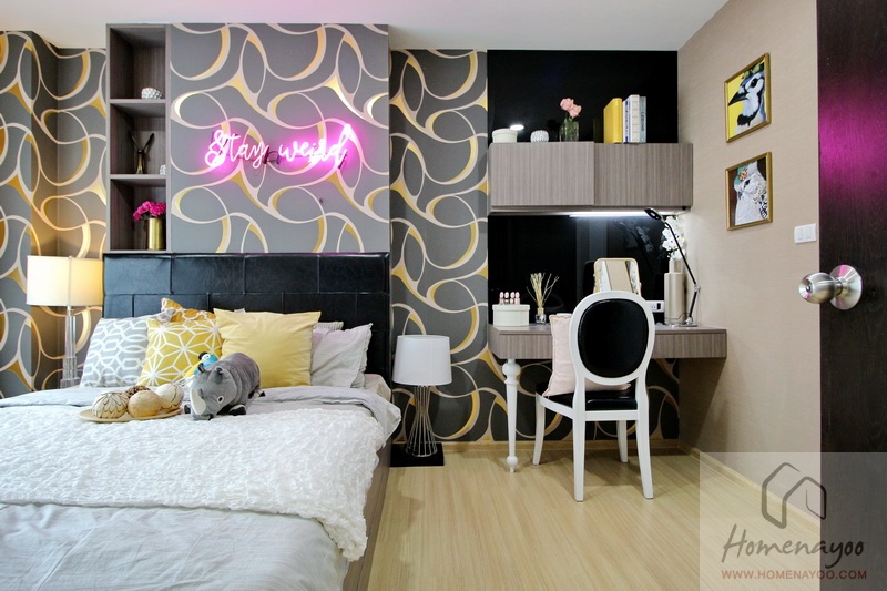 เปิดประตูเข้ามาจะเจอกับเตียงนอน, โต๊ะทำงาน และ ตู้เสื้อผ้าแบบเปิดโล่ง
