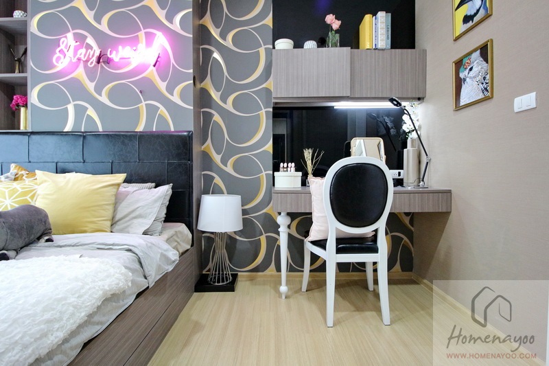 ข้างเตียงนอนโครงการบิวท์อินโต๊ะทำงาน พร้อมลิ้นชัก ขนาด 1.2 x 0.50 เมตร มีตู้เก็บของด้านบนซ่อนไฟ LED รวมถึงเก้าอี้มีพนักพิงให้ 1 ตัว ครบชุด