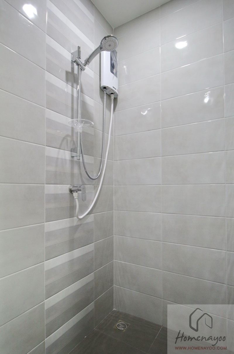 ขวามือเป็นส่วนเปียก ติดตั้งฝักบัว Hand Shower พร้อมราวปรับระดับสูง-ต่ำ + ที่วางสบู่ ก๊อกน้ำโครเมียมก้านโยก พร้อมติดตั้งเครื่องทำน้ำอุ่นของ Stiebel Eltron ให้พร้อมใช้งาน