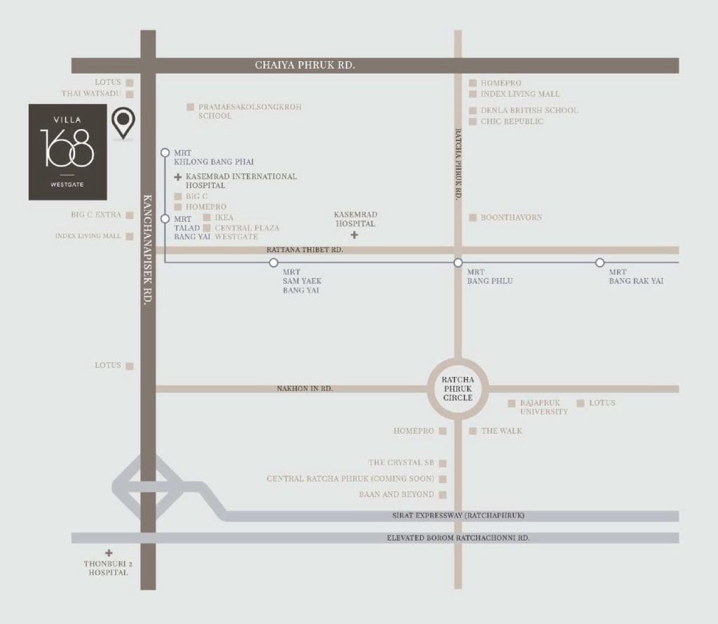 ทำเลที่ตั้งโครงการ โครงการ Villa 168 เวสต์เกต ถือว่าตั้งอยู่บนทำเลที่มีความโดดเด่นทางฝั่งตะวันตกของกรุงเทพฯ เพราะว่าอยู่ใกล้ Hub ใหญ่ที่เป็นใจกลางความอุดมสมบูรณ์ของฝั่งนี้ พูดแบบที่ทุกคนนึกออกก็คือ Central Westgate และ Ikea บางใหญ่ โดยโครงการจะตั้งอยู่ติดกับถนนกาญจนาภิเษกเลยค่ะ ซึ่งถือว่าเป็นโครงการที่หาได้ยากมาก เพราะเป็นโครงการขนาดเล็กที่มีบ้านเพียง 20 หลังเท่านั้น แต่ยังได้ความสะดวกสบายแบบติดถนนใหญ่แบบนี้