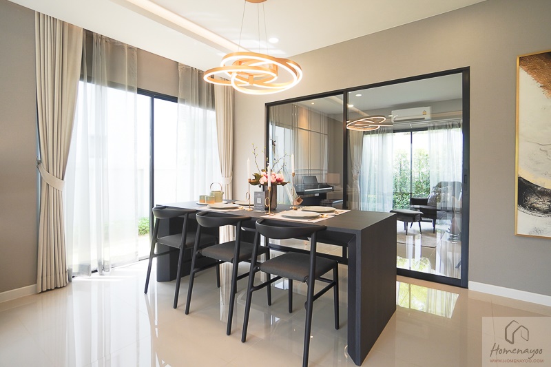 ถัดมาเป็นห้องรับประทานอาหาร บ้านตัวอย่างจัดโต๊ะขนาด 6 ที่นั่งมาให้ดูพื้นที่ใช้สอย บ้านก็ยังโปร่งค่ะ ได้พื้นที่แบบสบาย ๆ ฝั่งด้านข้างห้องรับประทานอาหารจะมีประตูบานเลื่อนเปิดเชื่อมกับสวนข้างบ้านได้ และมีประตูบานเลื่อนด้านหลังเชื่อมต่อกับห้องอเนกประสงค์ ซึ่งทางโครงการจะกั้นส่วนห้องมาให้เรียบร้อยแล้ว