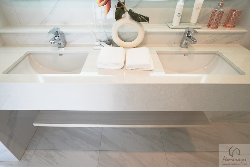 อ่างล้างมือเป็นอ่างแบบฝังบนเคาน์เตอร์แบบ His & Her ใช้ Top เคาน์เตอร์เป็นหินสังเคราะห์ลายหินสีขาว สวยเลยแหละ