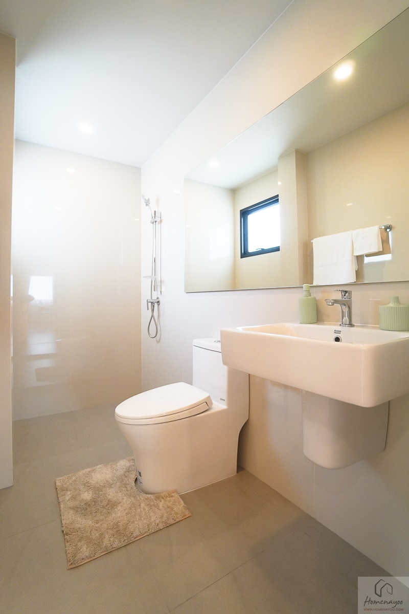 สำหรับห้องน้ำที่แชร์กันระหว่างห้องนอน 2 และ 3 จะมีการออกแบบที่พิเศษ คือมีการแยกอ่างล้างมือออกมาที่ด้านหน้าห้อง และกั้นส่วนโซนโถสุขภัณฑ์และโซนอาบน้ำออกไป เพื่อให้การใช้งานสะดวกสบายมากยิ่งขึ้น ยกตัวอย่างเช่น เวลาที่สมาชิกอีกคนกำลังอาบน้ำอยู่ อีกคนก็ยังสามารถล้างหน้าแปรงฟันได้ค่ะ