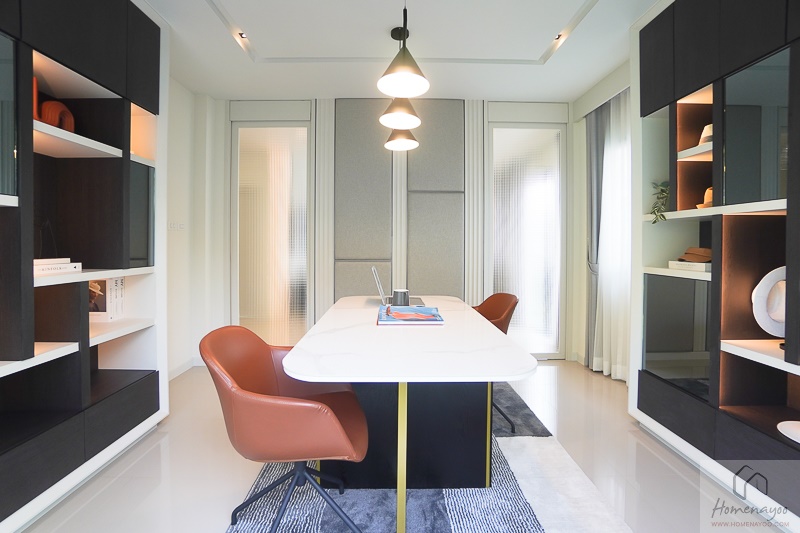 พื้นที่ห้องอเนกประสงค์ถือว่ามีขนาดใหญ่เลยค่ะ ทำให้เราสามารถปรับเป็นฟังก์ชันได้อย่างหลากหลายตามไลฟ์สไตล์ของแต่ละครอบครัวได้เลย อย่างบ้านตัวอย่างจัดเป็นห้องทำงานส่วนตัว ได้ Mood ที่ดีทีเดียว