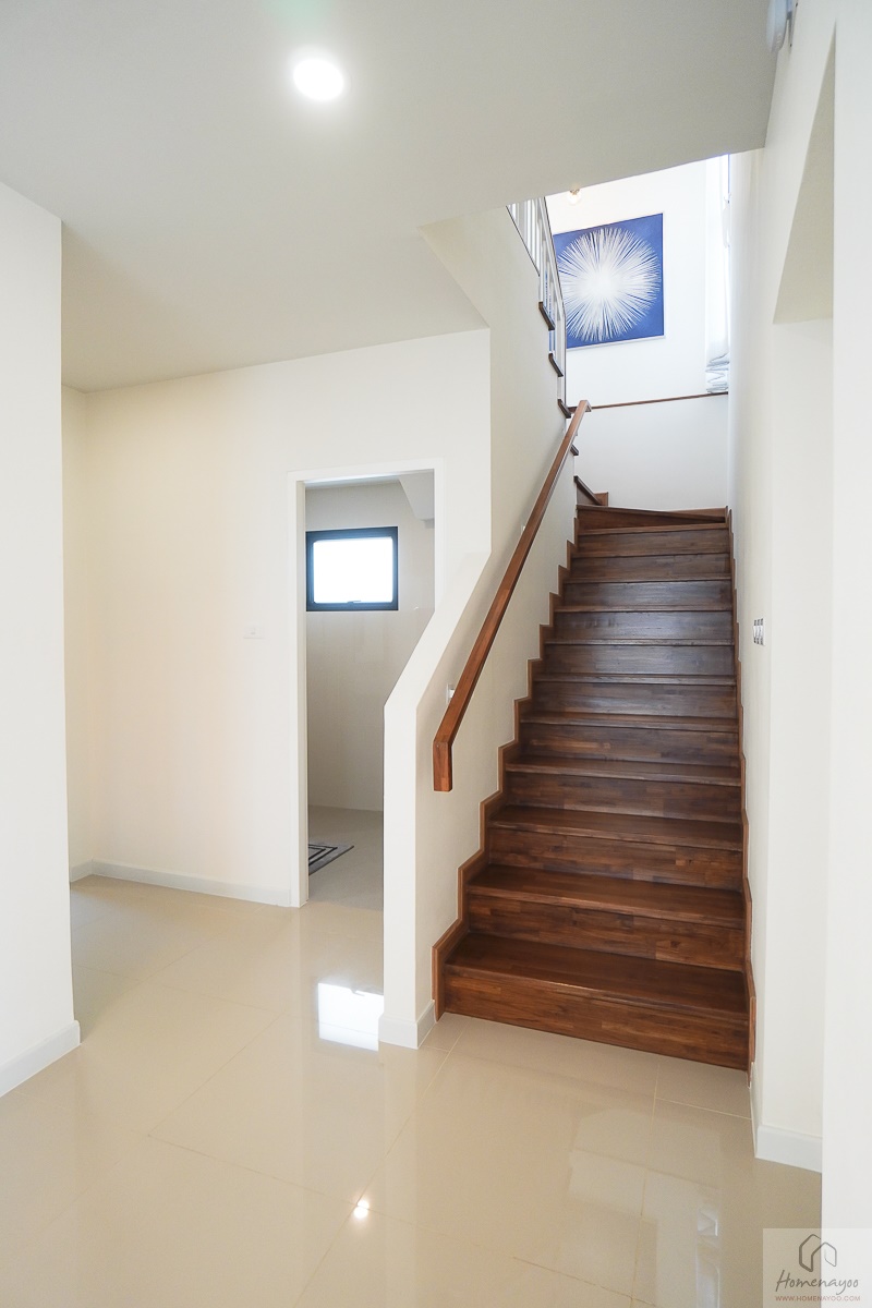 บันไดบ้านใช้โครงสร้างคอนกรีตเสริมเหล็ก ปิดผิวด้วยไม้สักอัดประสาน มีราวบันไดเหล็กฝังผนังและฝังพื้นติดตั้งมาให้ ใช้มือจับเป็นไม้สีเข้ากัน บริเวณตัวโถงมีหน้าต่างบานใหญ่ติดมาให้ ทำให้โถงรับแสงธรรมชาติได้ค่อนข้างเยอะ เวลากลางวันไม่เปิดไฟก็ยังสว่างอยู่ค่ะ