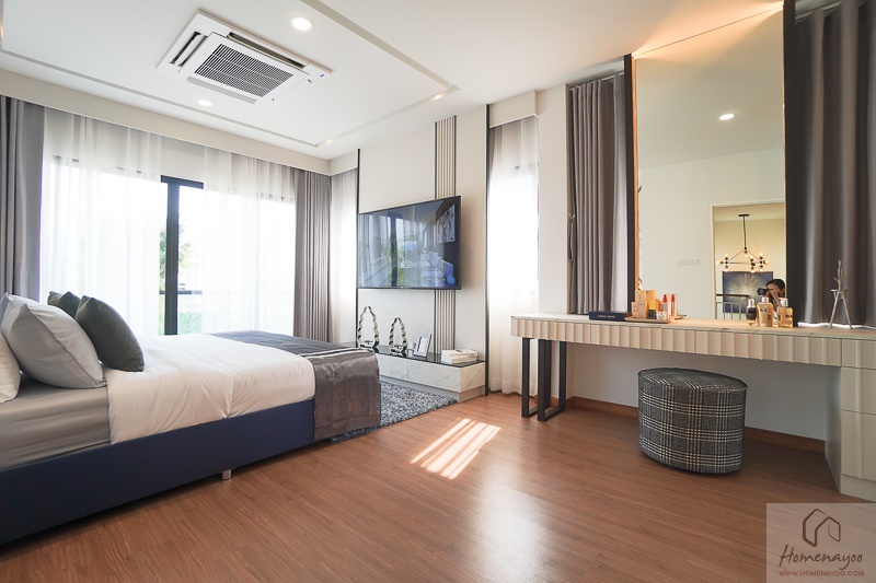 ห้อง Master Bedroom เป็นห้องที่กินพื้นที่ฝั่งหนึ่งของบ้านได้เลย ทำให้ได้พื้นที่มาขนาดใหญ่มาก และได้ช่องแสงมาค่อนข้างเยอะ