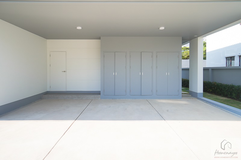 บ้านหลังนี้จะมีที่จอดรถให้ 3 คัน พื้นเป็นคอนกรีตปาดเรียบ บนฝ้าเพดานมีดวงโคม Downlight ติดตั้งมาให้ และมีตู้เก็บของให้ถึง 3 ตู้ด้วยกัน ใช้เก็บพวกอุปกรณ์ซ่อมบำรุงและอุปกรณ์ทำสวนได้