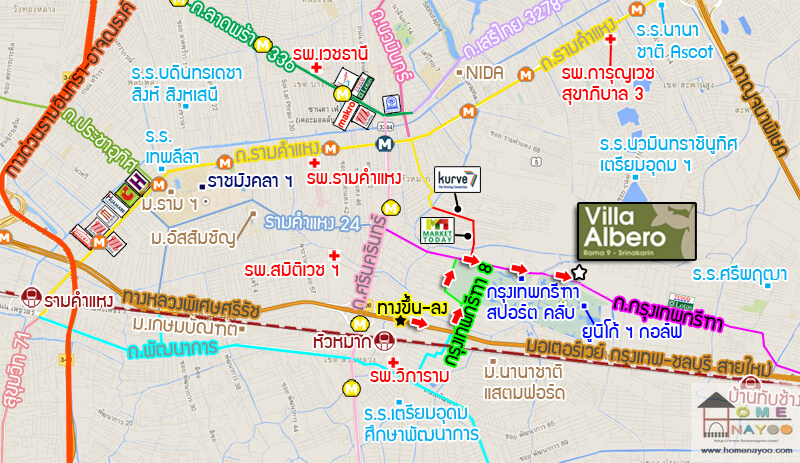 การเดินทาง เริ่มจาก ทางออก ถ.กรุงเทพกรีฑา มอเตอร์เวย์ กรุงเทพ – ชลบุรี (สายใหม่) > ซ.กรุงเทพกรีฑา 8 > ถ.กรุงเทพกรีฑา >—1.7 กม.—> วิลล่า อัลเบลโล่ พระราม 9 – ศรีนครินทร์ *ใกล้ซ.รามคำแหง 60